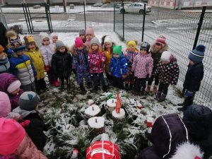Iestādes pagalmā ir sarūpēts lielais adventes vainags un katra grupa no lielā vainaga sveču liesmiņām iedegs savā grupas vainagā…