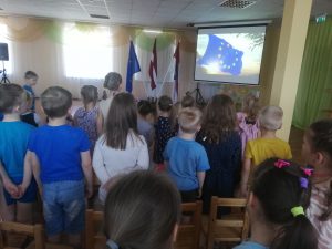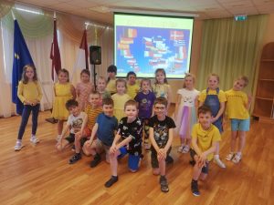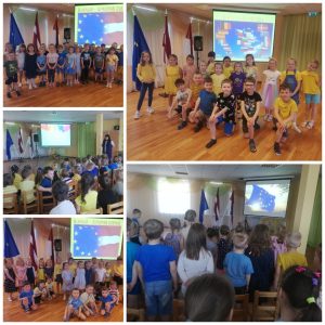 ES ir savs moto – “Vienoti daudzveidībā” un arī mēs darbojoties projektā “Erasmus+” esam sadraudzējušies ar daudzām valstīm. Šīs dienas ietvaros arī mūsu iestādē notika svinīgs brīdis par godu Eiropas dienai.Bērni nostiprināja zināšanas par ES, dziedāja dziesmas latviešu un angļu valodā, jo šī valoda tiek lietota saziņai ES un arī mēs to apgūstam no 4 gadu vecuma. Kopīgi gājām rotaļas…rumānu “Pinguin dance”, itāļu “Putniņdeja” u.c. Protams videoprezentācijā pastaigājām pa savas dzimtās pilsētas,Daugavpils, ielām…