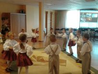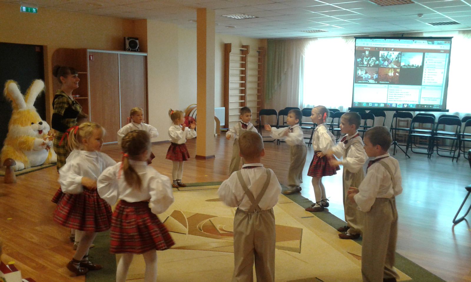 Par godu Eiropas valodu dienai mūsu iestādē tika organizēts pasākums, kura laikā gan pedagogi, gan bērni piedalījās starptautiskā video konferencē, kura dalībnieki bija Eiropas Savienības Erasmus+ programmas pamatdarbības Nr.2 (KA2) stratēģiskās skolu sadarbības partnerības projektā “C.L.E.V.E.R.- Children Learn English Very Easily and Rejoice” (Bērni mācās angļu valodu ļoti viegli un ar prieku) partneri no 9 Eiropas valstīm. Bērni, latviešu tautu tērpos ar Latvijas un partnervalstu karodziņiem rokās devās uz zāli, lai video konferences laikā sasveicinātos un sniegtu Latvijas priekšnesumu projekta partnervalstu bērniem. Gatavojoties Eiropas tautu dienai, bērni mācījās sveiciena dziesmu latviešu un angļu valodā, gatavojās prezentēt mūsu valsti ar latviešu tautas deju. Video konferences laikā bērni sūtīja sveicienus bērniem no Itālijas, Spānijas, Slovēnijas, Polijas, Rumānijas, Portugāles, Lietuvas un Turcijas. Pasākuma laikā bērni ar interesi vēroja jaunos draugus un priecājās par iespēju sazināties ar tik dažādiem tautu bērniem.