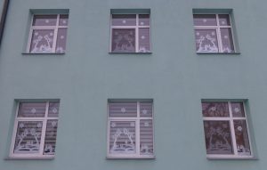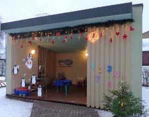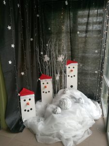 Dekorējam logus ar ziemīgiem skatiem, iestādes pagalms, ziemas tumšajā laikā, uzģērbj gaismu rotas. Bērnudārzā valda brīnumu pasakas atmosfēra. Vecāki sniedz patīkamas, skaistas atsauksmes mūsu iestādes noformējumam.
